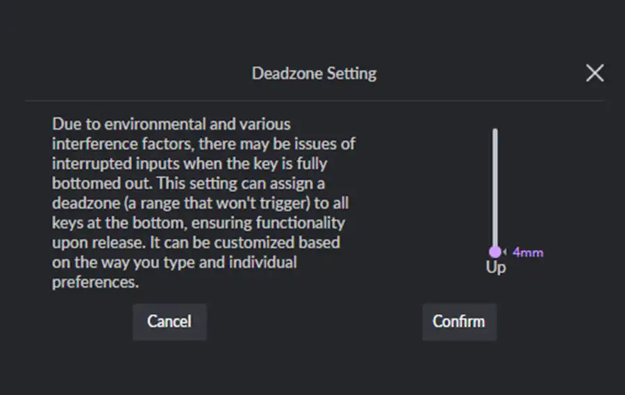 Deadzone représente une zone qui ne sera pas déclenchée. Avec les paramètres de zone morte, vous pouvez personnaliser la zone morte inférieure en fonction de votre style de frappe et de vos préférences, assurant des versions plus précises.