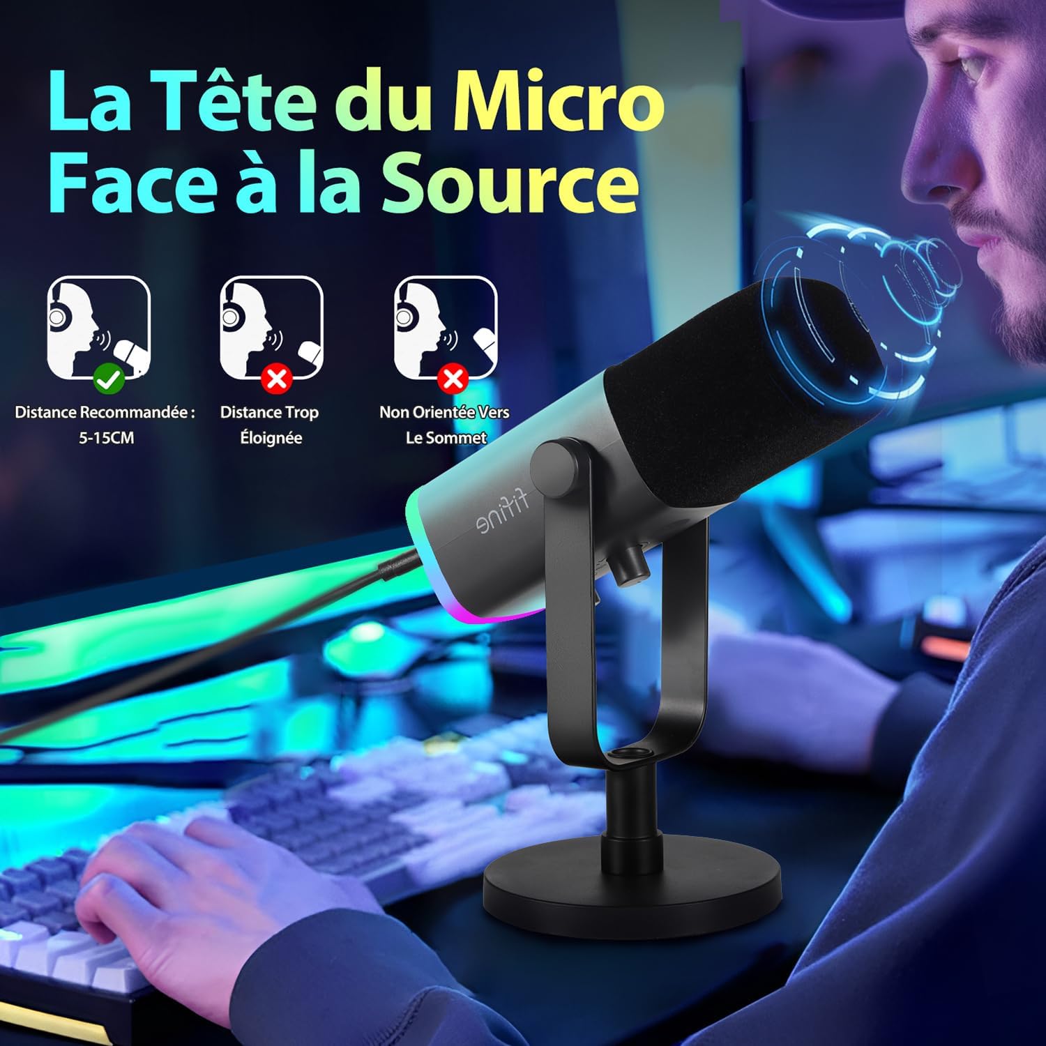 [Lumière RGB contrôlable] L’anneau RGB sur le microphone de jeu dispose de 3 modes d’éclairage et de plus de 10 couleurs, contrôlez le bouton de la touche RGB pour changer le schéma de couleurs du jeu, des effets d’éclairage sympas peuvent faire de votre jeu vidéo ou diffuser en direct un véritable focus. La bague RGB est équipée d’une fonction de mémoire, qui s’active automatiquement lorsqu’elle est allumée, et il n’est pas nécessaire de la réinitialiser à plusieurs reprises. (pour connexion USB uniquement)