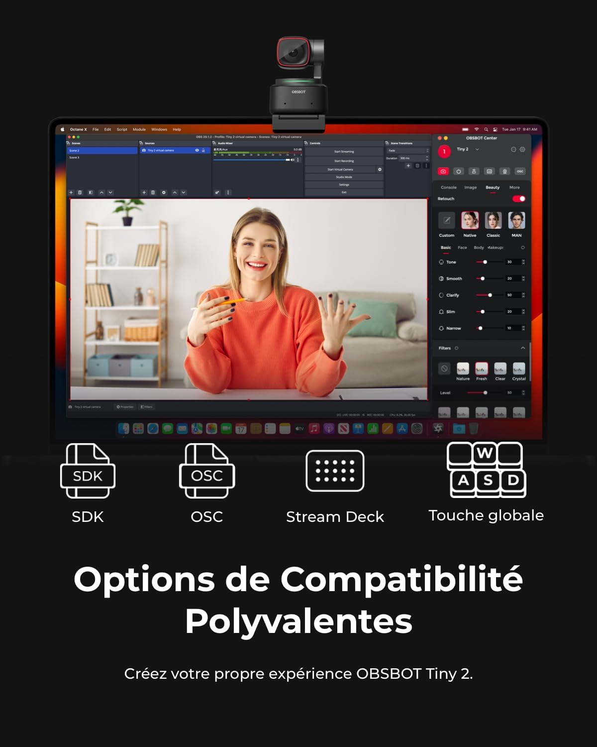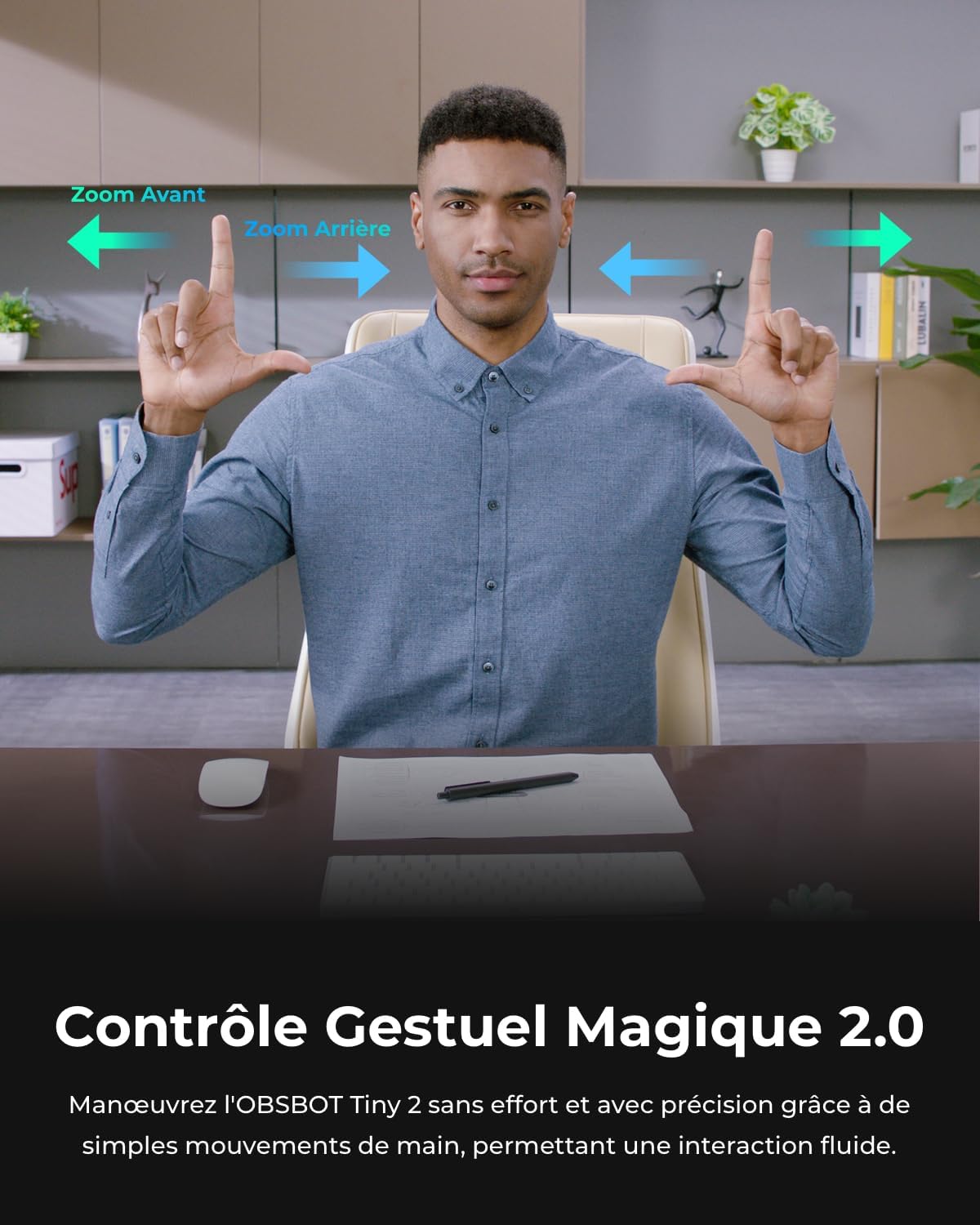 【Différents modes de commande】Commande vocale – Commandez la webcam OBSBOT Tiny 2 à l’aide de commandes vocales simples et intuitives (Veuillez noter : seulement 𝗶𝗻 𝗘𝗻𝗴𝗹𝗶𝘀𝗰𝗵 disponibles), telles que « Salut, Tiny », « Sleep Tiny » « Track Me », « Unlock Me », etc. Gesture Control 2.0 – Basé sur la fonction de contrôle gestuel existante de la webcam OBSBOT Tiny 4K, vous pouvez désormais contrôler le zoom de la caméra indépendamment via le mode gestuel et ainsi obtenir l’effet visuel souhaité de manière plus efficace.