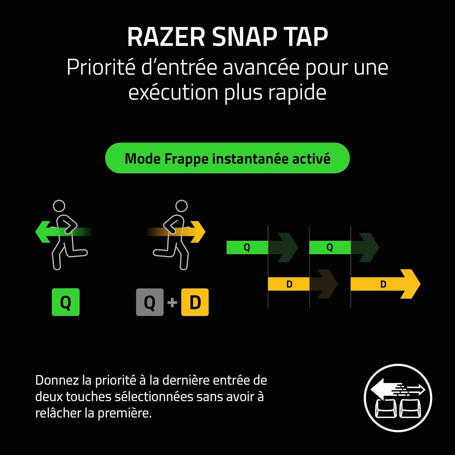 - RAZER SNAP TAP – Priorité d’entrée avancée pour une exécution plus rapide : Avec Razer Synapse 4, donnez la priorité aux entrées entre deux touches sans relâcher la précédente pour des contrôles plus rapides et plus réactifs, parfaits pour des changements de direction quasi instantanés dans le jeu.